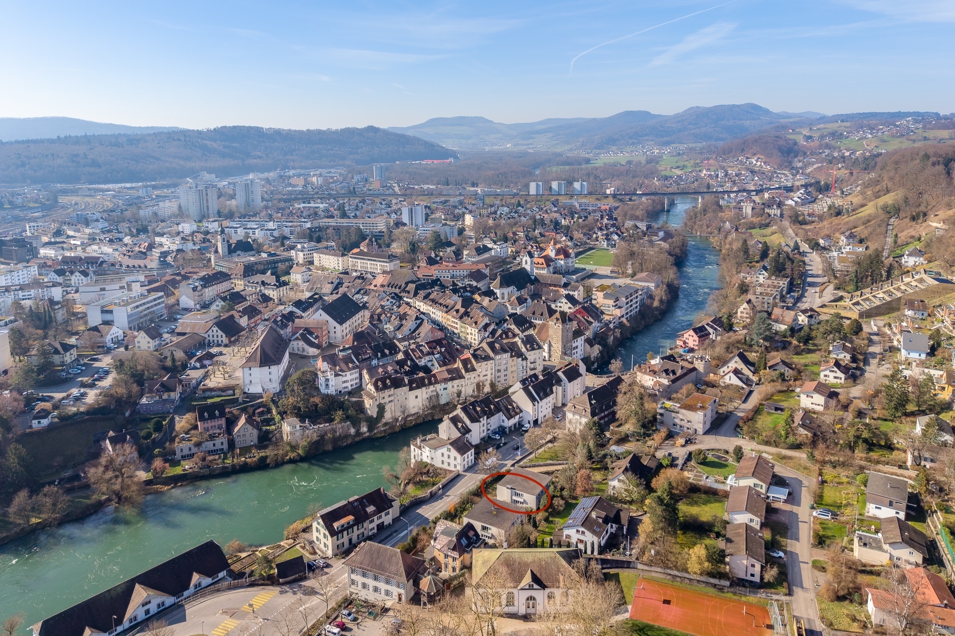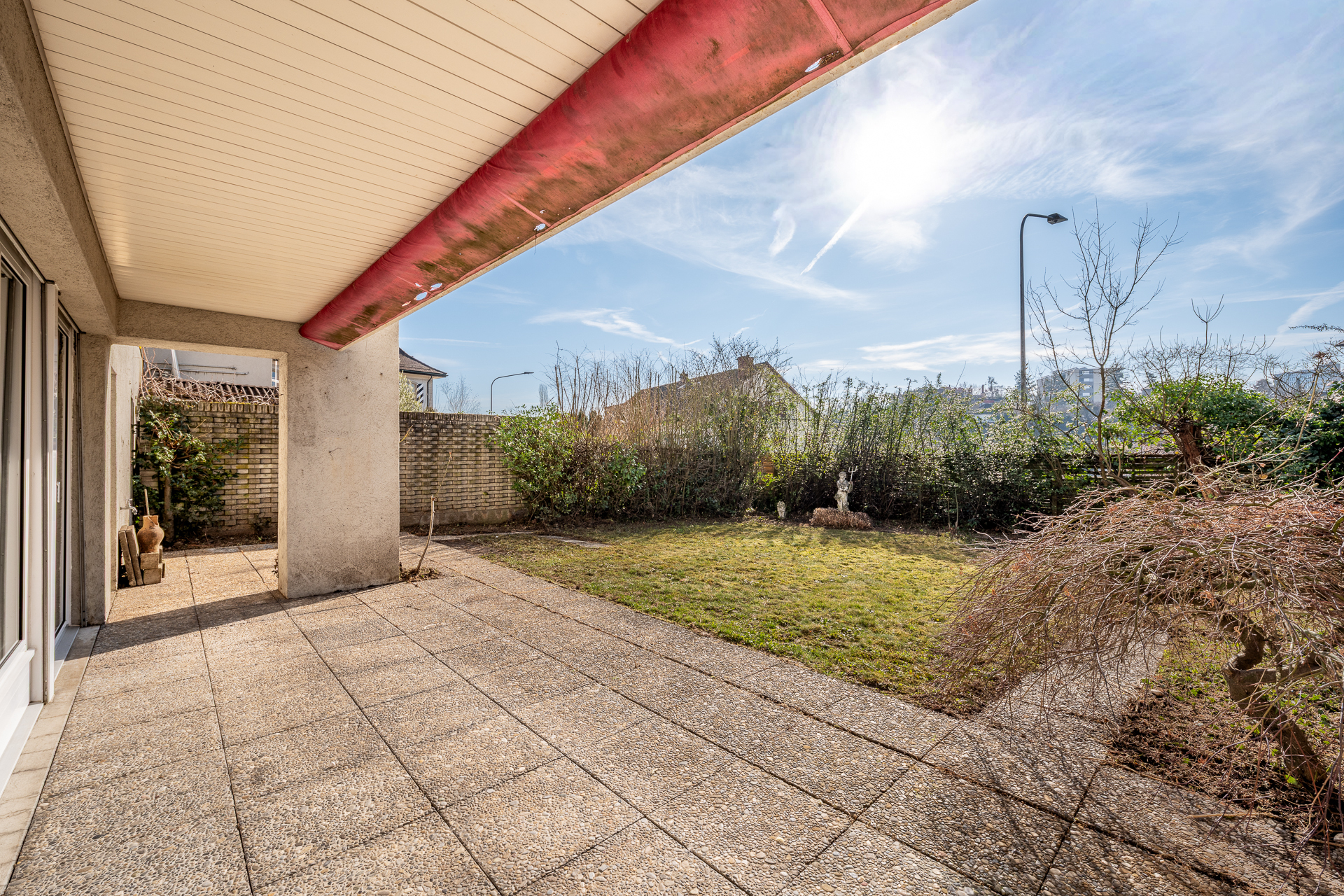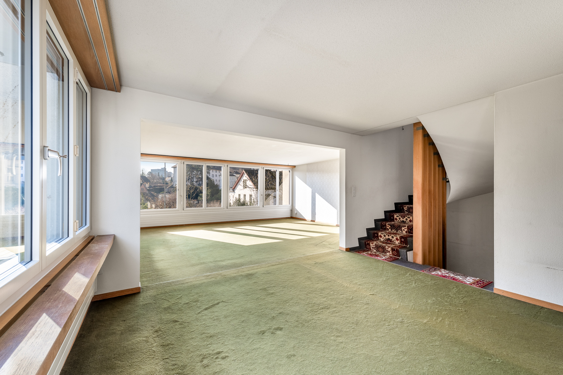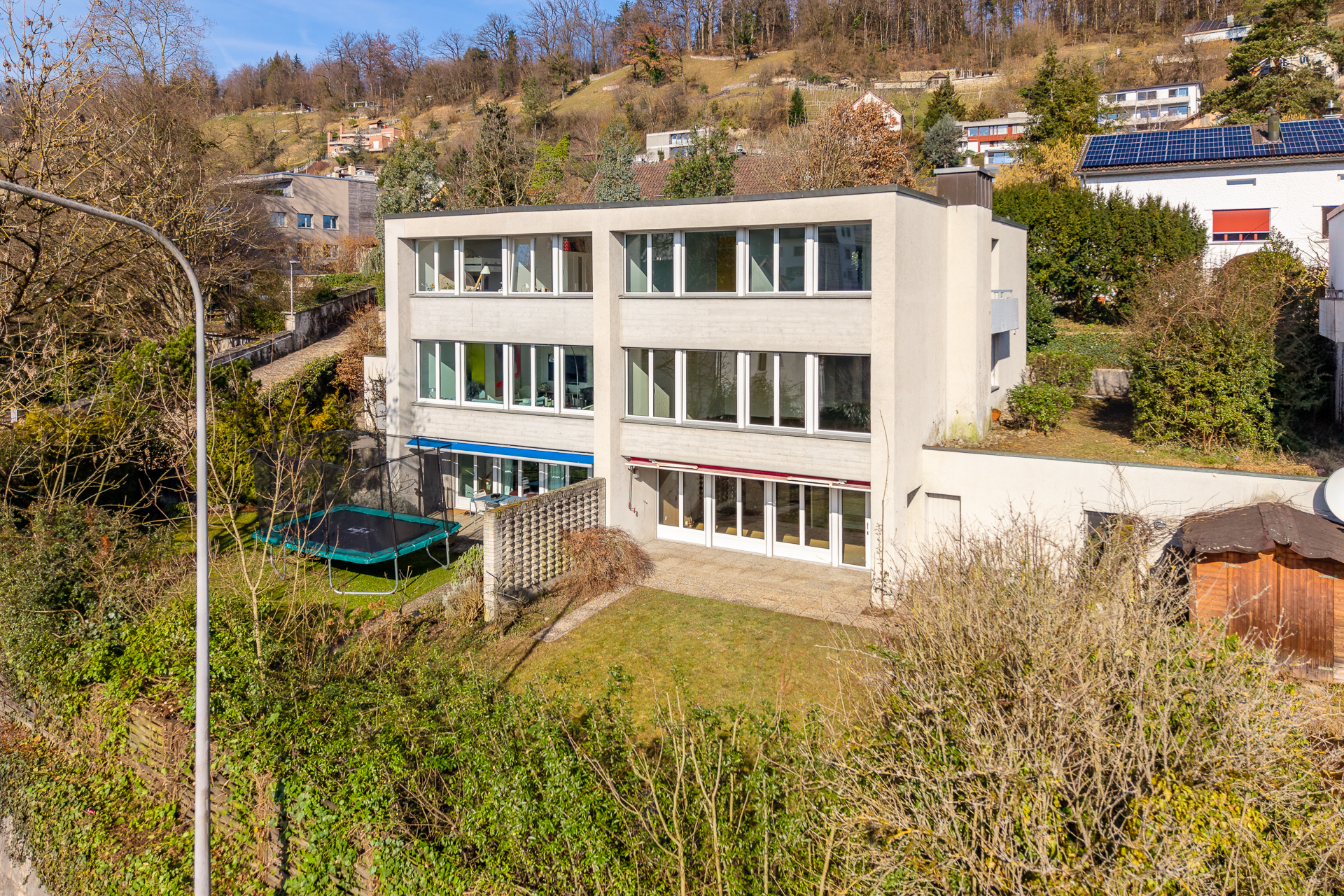 Stadthaus: Zentral, gross mit modernem Grundriss und insgesamt rund 187m2 Wohnfläche Praktisch uneinsehbar, liegt dieses sehr modern konzipierte DEFH fast im Herzen von Brugg. Unglaublich welch Raumangebot sich hier eröffnet. Drei Geschosse! Ein riesiger Wohnbereich und ein sehr individuell oder flexibel nutzbares Untergeschoss beziehungsweise Gartengeschoss! Von der Strasse her sieht man das Haus nicht. Dank der hohen Mauer werden die vorbeifahrenden Autos kaum wahrgenommen. Das UG mit Garten ist abgeschirmt. Ein typisch überlegtes, robustes Haus entworfen von der Brugger Architektendynastie Froelich mit einem kleinen Le-Corbusier-Touch. Insgesamt gibt es 4 solcher Häuser, wir verkaufen eines davon. Die 4 Häuser sind als Doppelhäuser konzipiert. Unterirdisch besteht eine Verbindung die zum Luftschutzkeller und zur neuen, modernen Heizzentrale mit Baujahr 2024 führt. Neu wird erneuerbar, mit Pellets geheizt. Die Stadt liegt Ihnen zu Füssen! Zentral gelegen: Alle Einkaufsläden, Schulen, Bahnhof Sportanlagen liegen in Gehdistanz. Die Aussicht über den Fluss zur Altstadt mit Salzhaus und den Ufergärten ist Museumswürdig. Der Zugang zu den Häusern befindet sich auf der Gebäuderückseite. Über den geschützten Haueingang (3.7m2) gelangen Sie in den abgetrennten Eingangsbereich. Hier befindet sich der Flur mit der Garderobe (9.2m2), ein Gäste-WC (2.3m2) und ein sehr praktisch gelegenes Reduit (2.5m2). Total bereits fast 18m2! Ein Durchgang führt in den offenen Wohn-/Essbereich (ca. 50m2!) und der seitlich angeordneten Küche (8.5m2). Wohn-/Essbereich mit einer über die ganze Breite führenden Fensterfront nach Süden mit einer fantastischen Aussicht: Das ist schon besonders gross, erst recht für eine Liegenschaft im Zentrum. Über die seitliche Treppe (4.6m2) gelangt man in die anderen Stockwerke. Im Obergeschoss befindet sich ein Flur (9.2m2) und in der Verlängerung ein gedeckter Balkon (3.9m2) Richtung Osten. Ideal um die Bettwäsche und die Kleider aus zu lüften. Auf der Nordseite ist das Elternschlafzimmer (20.4m2) fast schon ein Tanzsaal, mit eigenem Bad (5.8m2) und das über den Flur zugängliche allgemeine Bad (5.9m2) angeordnet. Auf der Südseite befinden sich zwei stattliche Schlafzimmer (mit je 16.5m2) diese sind mit Einbauschränken bestückt. Das UG wurde wie folgt aufgeteilt und genutzt: Ein Teil des grossen, zentraler Flurs (13.1m2) mit Lavabo diente als zusätzliches Gästezimmer. Der grosse Raum (22.7m2) der sich über die ganze Hausbreite zum Garten im Süden erstreckt, war ein grosser Gesellschaftsraum, in dem ein Cheminée untergebracht ist. Die beiden nördlichen Räume wurden als Weinkeller, Stauraum, Werkstatt und Waschküche genutzt. Ein gedeckter Sitzplatz ist dem Gesellschaftsraum vorgelagert. Seitlich befindet sich ein sonniger Aussensitzplatz. Das alte Jacuzzi im Garten stand perfekt, musst aber leider altershalber entfernt werden. Ein seitlicher, abschliessbarer und ungeheizter Raum diente als Geräteraum. Der Garten erstreckt sich, dank der Richtung Süden ausgedehnten Parzellenform, breiter als das Haus. Somit kann hier ein Paradies eingerichtet werden. Zur Liegenschaft gehört eine Einzelgarage mit elektrischem Sektoraltor. Liegenschaftszustand: Viele Fenster wurden bereits mit Dreifachverglasung erneuert. Die gemeinsame Heizanlage ist neu. Die Bäder mit den kleinen Mosaiksteinchen sind eigentlich wieder modern. Bodenbeläge und Wandbeläge, müssen ersetzt werden vielleicht auch die Küche. Die neue Eigentümerschaft hat hier Gelegenheit Ihren eigenen Geschmack und Ideen einzubringen und zu verwirklichen. Haben wir Ihr Interesse geweckt? Melden Sie sich noch heute. Preisvorstellung ab CHF 1'075'000 Bei mehreren Interessenten wird EINE, zeitlich kurze Gebotsrunde durchgeführt.