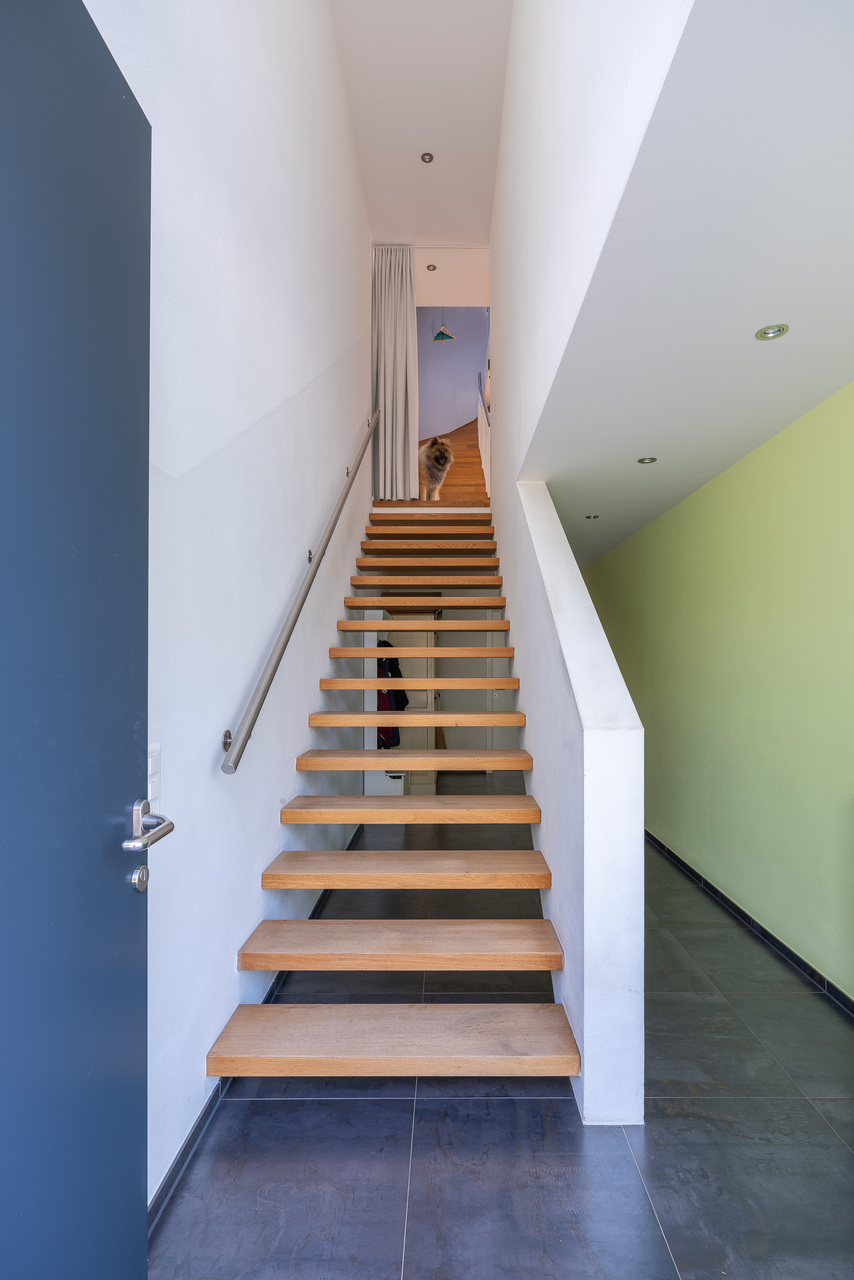 Eine Treppe führt vom Eingangsbereich im Untergeschoss in den offen gestalteten Wohn- und Essbereich im Erdgeschoss.