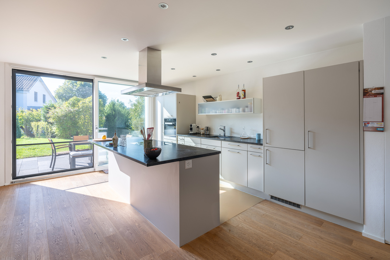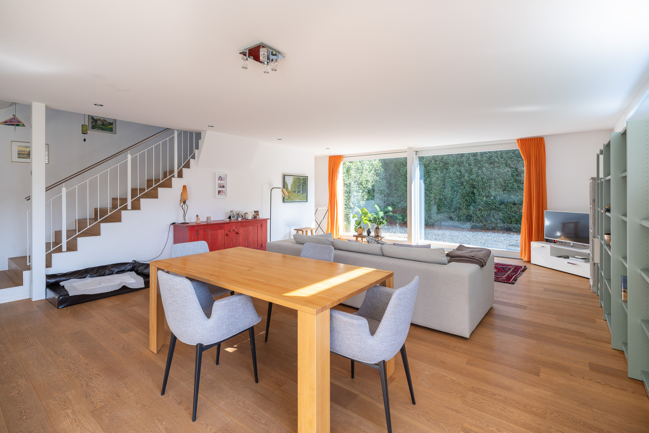 Eine grosse Fensterfront mit direktem Zugang zum südlich ausgerichteten Garten sorgt für ein helles und einladendes Ambiente.